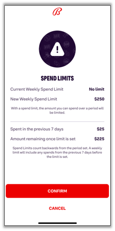 You can set limits daily, weekly, or monthly based on your preference. Once you click 'Confirm,' the limit takes effect immediately and considers any prior spending. For example, if you set a weekly limit of $250 and have spent $25 in the last 7 days, you can only spend $225 for that period.