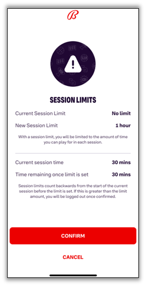 When you choose your desired Session Limit, you will be prompted to review and confirm your selection, which will be activated immediately upon clicking 'Confirm.' The limit takes effect as soon as you log in. For example, if you've already been logged in for 30 minutes and set a 1-hour session limit, you will have only 30 minutes left to play until the limit resets.